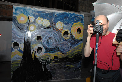 The images above, for Your complete erudition and amusement, show a few of the paintings created by YT for A&M, as well as an image of Annie, YT, Jana, Heather mid-event. The painting images: bat bevy, a trio of prostitues based on a 19th-century etching, The Starry Night (image shows Richard Wicka in foreground with his usual cam apparatus-he was with Gwen who interviewed me for a podcast of some kind, I did not give one straight answer, we ended interview discussing shoes, as usual), a martini in which two faces became olives, and a lemur (Jana is demonstrating). And Anna be-be-low, in the fab oatroom-2 tons of raw oats and a vid of grain scoopers from The Ward projected onto the ceiling of the fabricated, circular chillout space.